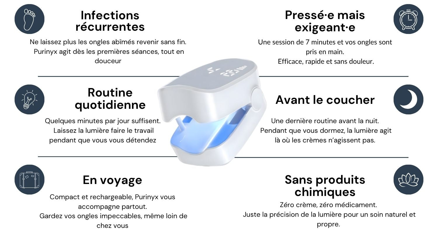 Après plusieurs années à lutter contre les mycoses d’ongles, j’étais sceptique… mais le Purinyx DuoBeam™ a vraiment changé la donne.